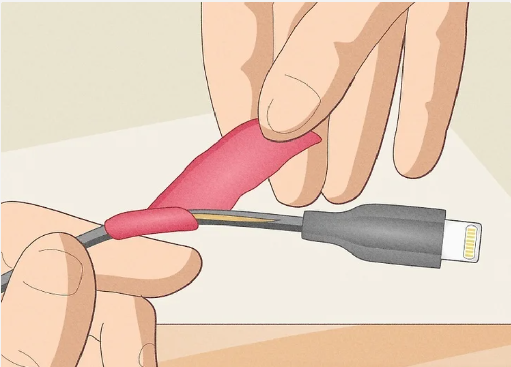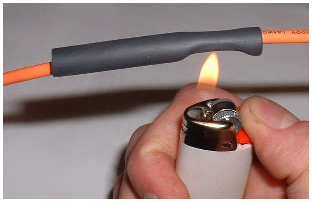 Понадобится термоусадочная трубка соотношением 2:1, чтобы при нагревании она уменьшилась вдвое относительно первоначального своего диаметра. Трубка пластиковая, используется для изоляции или покрытия проводов. Нагревать можно феном, направляя струю горячего воздуха к установленной на повреждённом участке провода трубке. Метод подойдёт для любого типа кабеля, включая длинные участки кроме тех, чей конец больше, к примеру, зарядных устройств, т.к. в трубку не пройдут большие концы. Лучше всего работает на электропроводах, где диаметр совпадает.