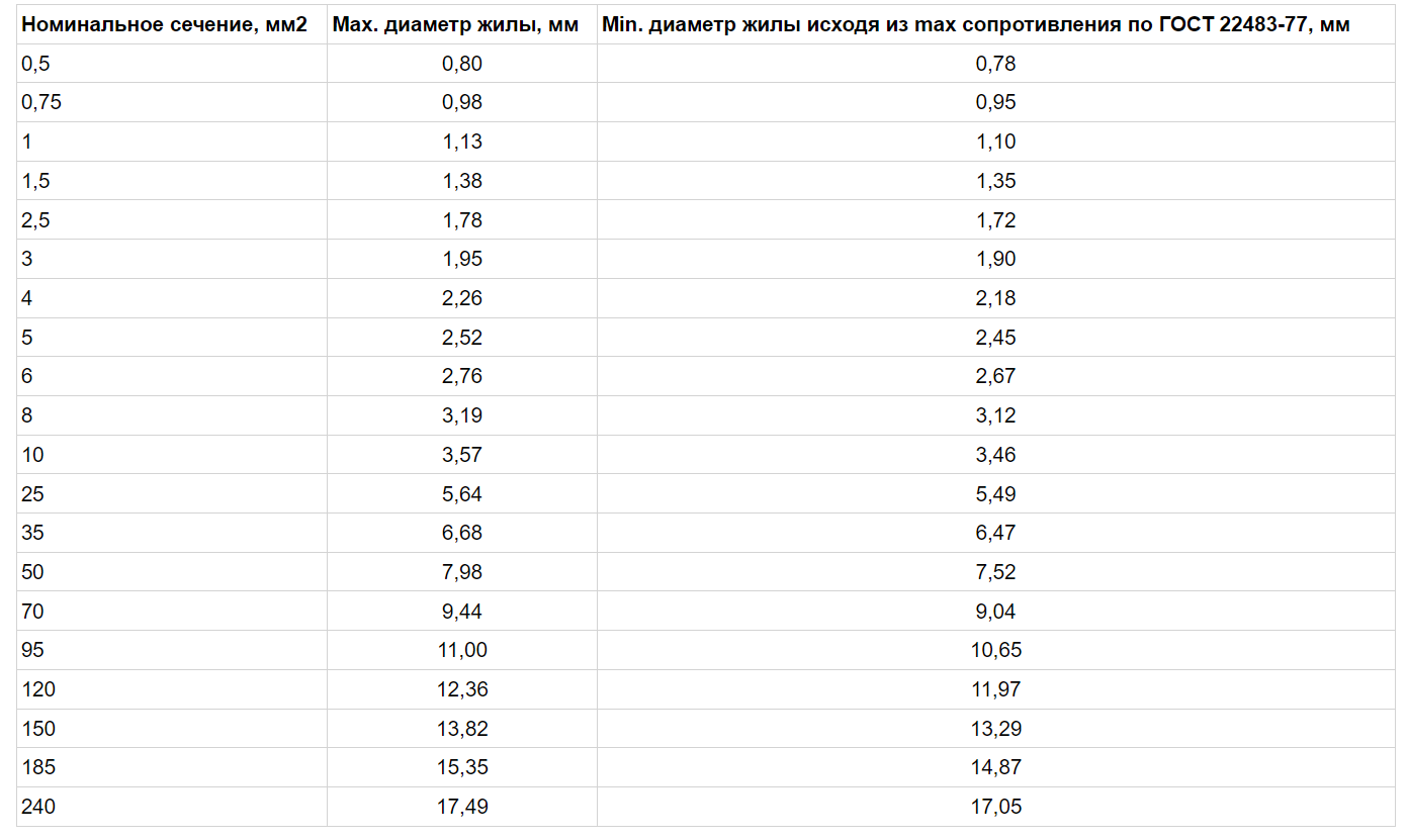 Высокое качество производимых в России кабельных изделий регламентирует ГОСТ 22483-77, там же есть таблица показателей, с которыми можно сравнивать результаты своих вычислений. Например, для ВВГ – марки проводников с гибкостью 1:
