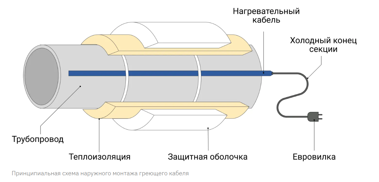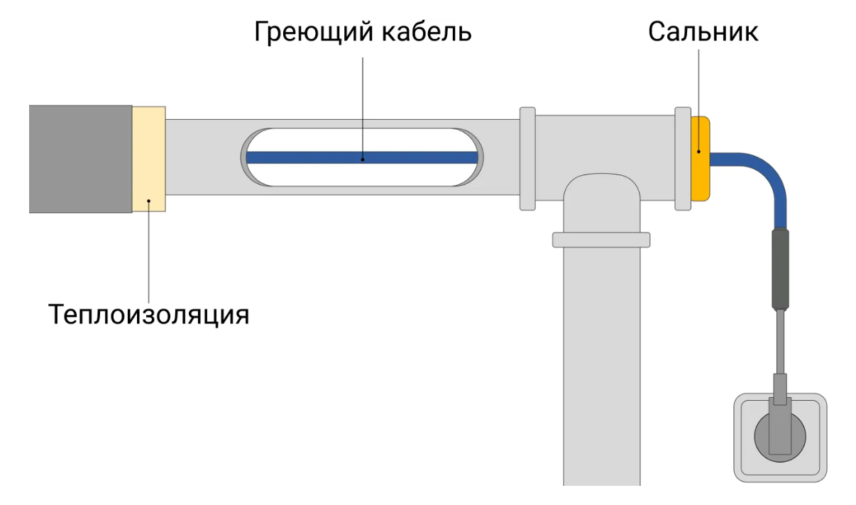 | Снаружи трубы | Кабель закрепляют снаружи, крепя к трубе сбоку / внизу, закрепляя хомутами или обычным скотчем. При монтаже трубопровод не отключается, нужен доступ – невозможно будет закрепить на трубы под землёй и в коробе. Работе не помешают краны, трубные разветвления или фильтры, кабель огибает всё. С герметичностью также не возникнет проблем, можно ставить любую длину. |