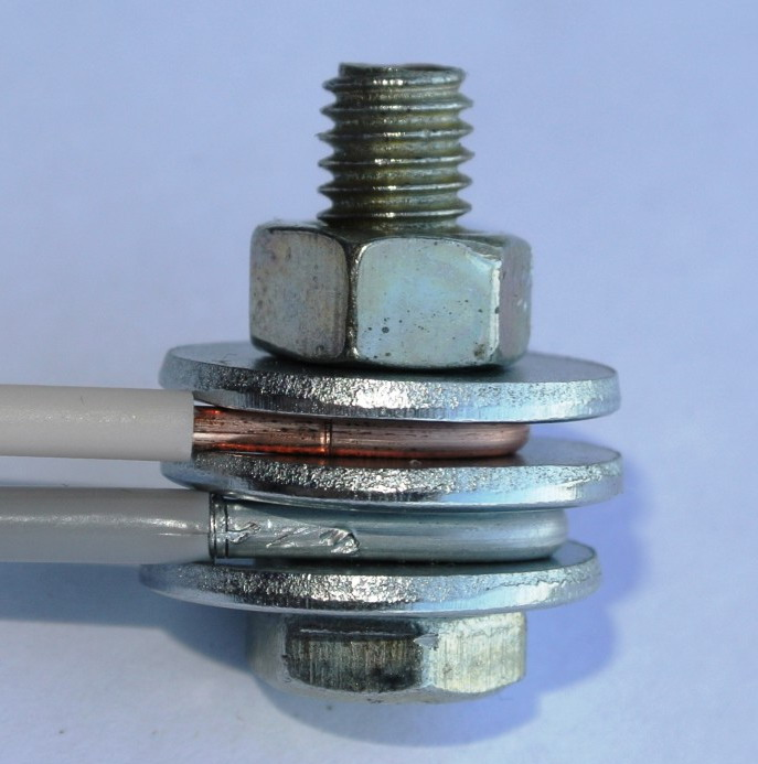 Соединение с болтом – конструкция включает большой болт, гайку и 3 шайбы. Пригодится, когда под рукой не окажется материалов на исполнение вышеперечисленных вариантов. На резьбу болта сначала надеть шайбу, далее зачистив жилу, накрутить сверху шайбы кольцами. Установить далее 2 шайбу, жилу и 3 шайбу, закрутить плотно и изолировать гайку. Так удобно соединять медные или алюминиевые жилы проводов.